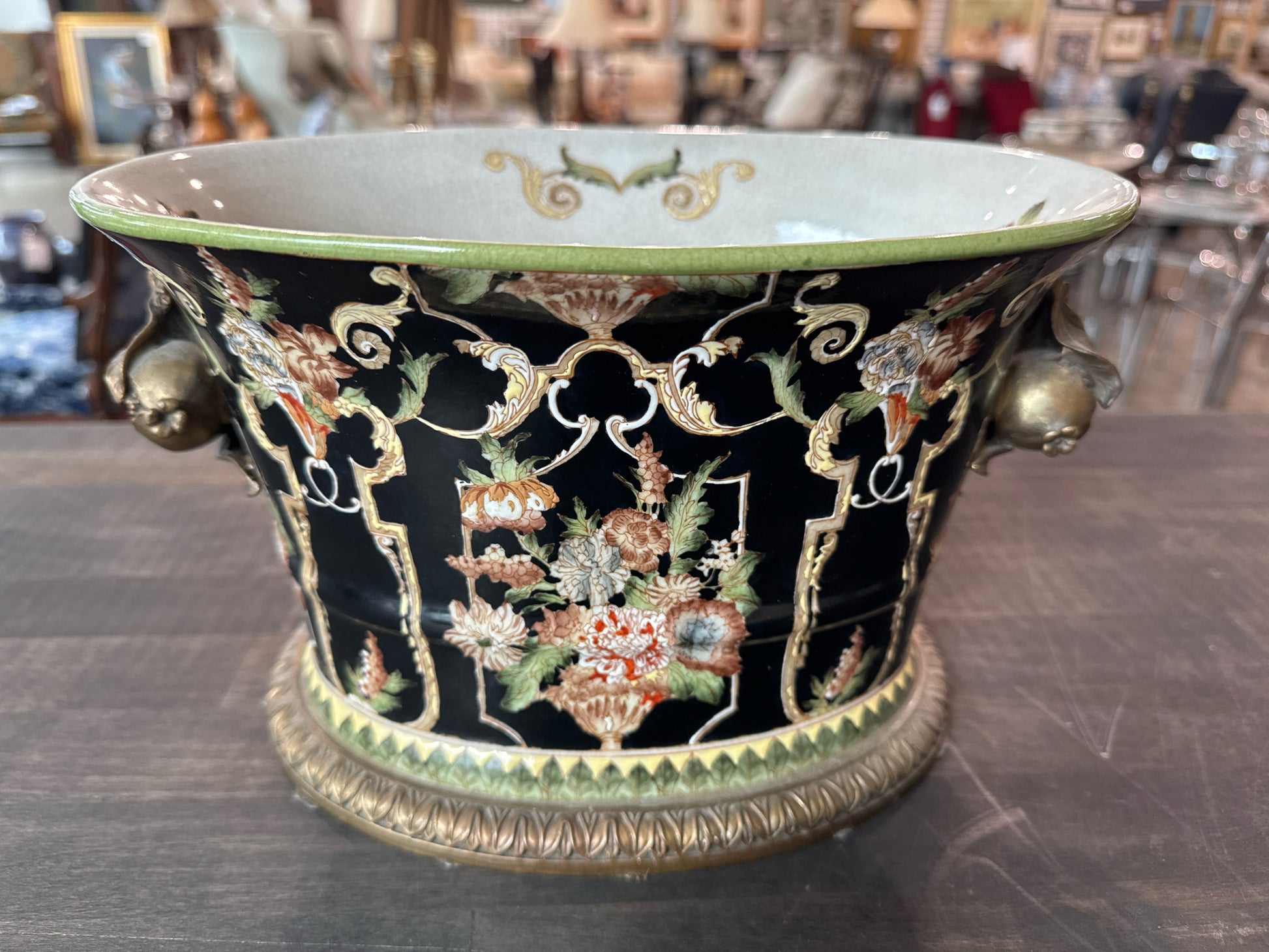 Nior Oval Hand Painted Ceramic Jardiniere with Brass Pomegranate Handles